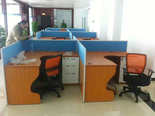 公司職員區(qū)采用思進(jìn)家具板式辦公桌SUV02-PF3624訂做藍(lán)色屏風(fēng)和櫻桃色膠板